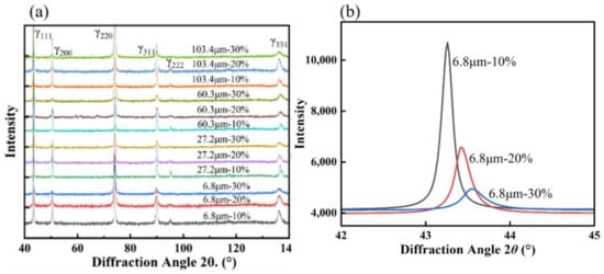 To investigate the effect of dislocation multiplication on the work-hardening behavior of the samples with different grain sizes, XRD analysis was first performed. The XRD patterns of rolled samples with different grain sizes are shown in Figure 9. According to the diffraction pattern, the samples still had single-phase austenite microstructure after plastic deformation, and no martensite phase transformation occurred. Therefore, the strengthening mechanism in the experimental steel was mainly the TWIP effect, but not the TRIP effect. As can be seen in b, the intensity of some diffraction peaks decreased significantly with the increase in plastic strain, and the diffraction peaks were shifted and broadened during the plastic deformation process. This corresponds to the lattice strain behavior during the elastic-plastic deformation of the experimental steel, where the elastic lattice strain causes a shift of the diffraction peaks and the plastic lattice strain causes a line profile broadening of the diffraction peaks [,,].