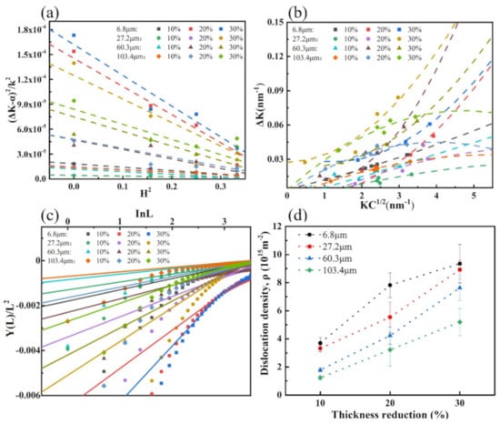 In summary, a plot of and in the mWA-based method for experimental steels with different plastic deformation methods under different strain is obtained, as shown in Figure 10c, and the slope of its trend line is the estimated dislocation density. The results of the dislocation density estimated by the mWH/mWA method are shown in Figure 10d. It can be seen that the samples with a smaller average grain size have a higher dislocation density due to the increase in grain boundary area and accelerated dislocation proliferation and tangling at a 10% rolling reduction. The dislocations in the samples with the average grain size of 6.8 μm and 27.2 μm proliferated rapidly and reached near saturation with the increase in the reduction to 20%; therefore, the dislocation density growth rate of these two rolled samples decreased significantly when the reduction amount continued to increase to 30%. The disappearance of the work-hardening stage II in the work-hardening behavior is shown, which is consistent with the results of the work-hardening rate curves in Figure 4.
