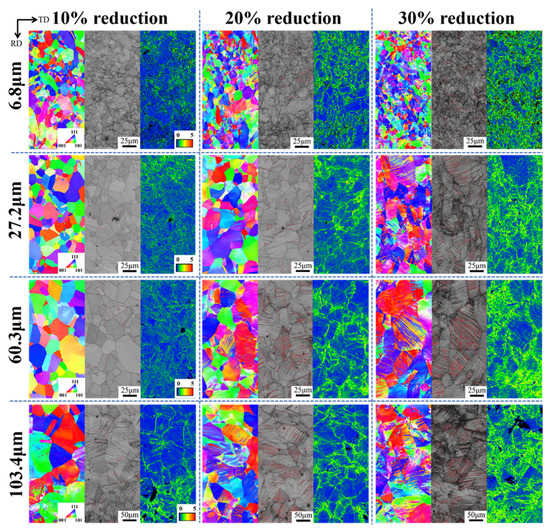 From the inverse pole figure (IPF) and IQ maps, it can be seen that the twinning behavior of the annealed samples varied considerably with grain size. At a 10% reduction, only a small number of annealed twins existed in the three groups of smaller grain sizes (6.8 μm, 27.2 μm, and 60.3 μm), and the grain morphology was intact and clear. While the average grain size of 103.4 μm started to deform in the rolling direction, with slip bands and mechanical twinning. However, the volume fraction of the twins in the four groups of samples was not significantly different at a 10% reduction due to the presence of a small number of annealed twins in the other three groups of samples. With the increase in the rolling reduction to 20%, the average grain size samples of 60.3 μm and 103.4 μm showed a large increase in internal twins and the volume fraction of twins increased rapidly. The two groups of samples with an average grain size of 6.8 μm and 27.2 μm showed an increase in slip lines, and there were a small number of mechanical twins with low twin density. When the reduction was increased to 30%, many mechanical twins were seen in the samples with an average grain size of 27.2 μm, 60.3 μm and 103.4 μm, and the grains were significantly deformed along the rolling direction. Activated secondary twinning was observed in the sample with grain size of 103.4 μm. The average grain size of 6.8 μm was not significantly deformed along the rolling direction, and the number of twinned grains was still few and scattered throughout the sample. The fine grain size increased the critical nucleation stress for mechanical twinning and thus hindered the development of mechanical twinning, satisfying a relationship similar to the Hall-Petch relationship []: