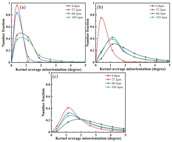 The distribution of KAM values can be observed visually by the distribution of strains in samples with different grain sizes under different rolling reductions []. The number fraction of KAM values at high angles increased as the strain increased and the plastic lattice strain increased, as shown in Figure 12.