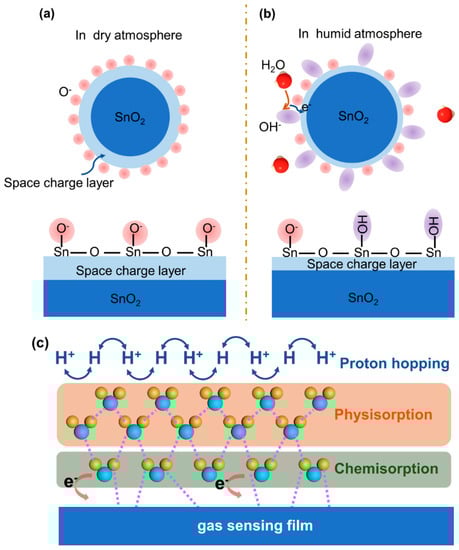 Schematic diagram of gas−sensing model for SnO2 in (a) dry atmosphere and (b) humid atmosphere. (c) Schematic illustration of chemisorption and physisorption of water molecules in high-humidity conditions.