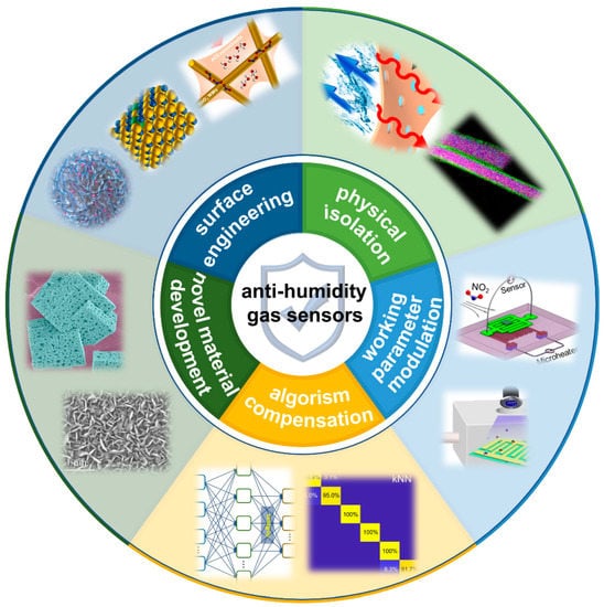 To suppress the humidity interference on gas detection, various strategies have been proposed, including surface engineering, physical isolation, working parameter modulation, algorism compensation, and novel material development, as shown in Figure 2. These strategies will be successively discussed in the next section in detail.