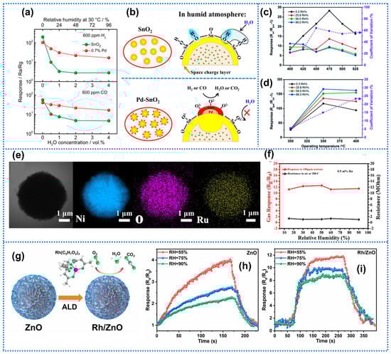 (a) Sensor response to 600 ppm H2 and CO for SnO2 and 0.7% Pd−SnO2 in different humidity conditions at 300 °C. (b) Schematic diagram of the gas-sensing model for pure SnO2 and Pd-SnO2 in humid environments. Reprinted with permission from Ref. []. Copyright 2015, American Chemical Society. The response and corresponding CV value of 49.4 ppm benzene gas with different RH environments at different operating temperatures of (c) pure Sn-ZnO sensor and (d) Au-decorated Sn−ZnO sensor. Reprinted with permission from Ref. []. Copyright 2017, The Royal Society of Chemistry. (e) TEM images and corresponding elemental mapping images of 0.5 at% Ru−doped NiO sample. (f) Baseline resistance and gas response to 100 ppm acetone of the 0.5 at% Ru−doped NiO sensor as a function of relative humidity. Reprinted with permission from Ref. []. Copyright 2020, Elsevier. (g) Schematic synthesis of Rh/ZnO flower-like nanostructures; the response of sensors to 10 ppm TMA under different RH environments, (h) Pure ZnO, and (i) Rh/ZnO sensors. Reprinted with permission from Ref. []. Copyright 2022, Elsevier.