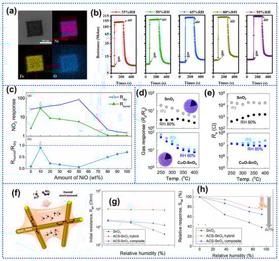 (a) The elemental mapping images of NiO/NiFe2O4-1.5. (b) Dynamic sensing curves of NiO/NiFe2O4-1.5 sensor toward 100 ppm acetone at the working temperature of 200 °C under different RH environments. Reprinted with permission from Ref. []. Copyright 2022, Elsevier. (c) Responses of NiO-ZnO composites depending on NiO contents under dry (open triangle) and humid (filled triangle) atmosphere and the Rhumid/Rdry values of the composite NiO-ZnO composites depending on NiO contents. Reprinted with permission from Ref. []. Copyright 2021, Elsevier. Gas-sensing characteristics of pure and 2.0 at% CuO-loaded SnO2 hollow spheres. (d) Gas response (Ra/Rg) to 1 ppm H2S and (e) baseline resistance in air (Ra). Reprinted with permission from Ref. []. Copyright 2014, Elsevier. (f) Schematic illustration showing the water-trapping effect of 2D ACS nanosheet in the spider-web-like SnO2 NWs. (g) Baseline resistance and (h) relative response (Srel = Swet/Sdry) of SnO2 NWs, ACS-SnO2 hybrid, and ACS-SnO2 composite at 150 °C to 10 ppm NO2. Reprinted with permission from Ref. []. Copyright 2022, Elsevier.