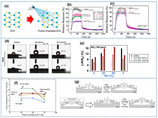 (a) Schematic diagram of proton-irradiated ZnO gas sensors. Dynamic relative response plots of different gas sensors to 10 ppm NO2 at 300 °C under various humidity conditions. (b) Pristine ZnO and (c) 1 × 1013 protons/cm2 proton-irradiated ZnO. Reprinted with permission from Ref. []. Copyright 2021, Elsevier. (d) Water contact angle of pristine carbon nanotubes and fluorinated carbon nanotubes in 30 s. (e) The relative sensor response to 100 ppm NO2 at variable humidity conditions for pristine and Ar:F2 plasma fluorinated carbon nanotubes with different fluorination yields. Reprinted with permission from Ref. []. Copyright 2019, Elsevier. (f) Non, dry air, room air, and high-humidity aged Pd/SnO2 under different humidity conditions and 400 g/m3 T–VOC test gas concentration. (g) Schematic images of the surface conditions of Pd-loading area on the non-aged Pd/SnO2 and high-humidity aged Pd/SnO2. Reprinted with permission from Ref. []. Copyright 2010, MDPI.