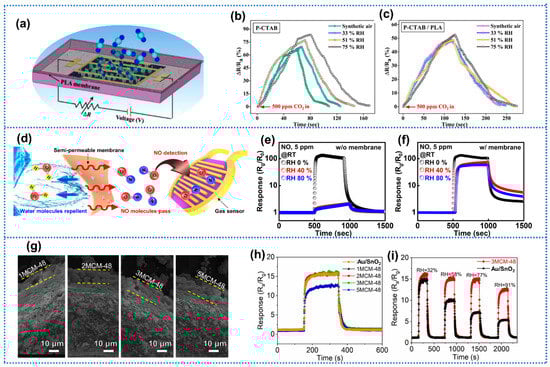 (a) Schematic diagram of sensor with PLA membrane coating. Effect of humidity on (b) P-CTAB and (c) P-CTAB/PLA sensors toward CO2. Reprinted with permission from Ref. []. Copyright 2020, American Chemical Society. (d) Schematic illustration of the principle of enabling gas measurements in humid conditions. Semipermeable membranes (polydimethylsiloxane, PDMS, thickness ~50 μm) selectively allow for the passage of gas molecules while acting as a barrier to water molecules. The dynamic responses of integrated gas sensors (e) without and (f) with a semipermeable membrane to 5 ppm NO2 at several levels of relative humidity. Reprinted with permission from Ref. []. Copyright 2020, Springer. (g) SEM image of a formaldehyde sensor device with different thickness of MCM-48 layer. (h) Response values of the pure Au/SnO2, 1MCM-48-Au/SnO2, 2MCM-48-Au/SnO2, 3MCM-48-Au/SnO2, and 5MCM-48-Au/SnO2 at 25% RH, respectively. (i) Dynamic curve of 3MCM-48-Au/SnO2 and Au/SnO2 sensors at different RH environments. Reprinted with permission from Ref. []. Copyright 2022, Elsevier.