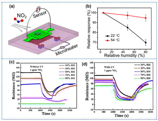 (a) Schematic illustration of the synthesis of 3D SnO2/RGOH sensor with a microheater. (b) Plot of relative responses of SnO2/RGOH to 3 ppm NO2 vs. RH at 22 and 54 °C, respectively. Reprinted with permission from Ref. []. Copyright 2020, American Chemical Society. Sensing characteristics of WS2/PbS sensor to 1 ppm NO2 at different humidity conditions (c) without and (d) with UV−light illumination. Reprinted with permission from Ref. []. Copyright 2021, Elsevier.