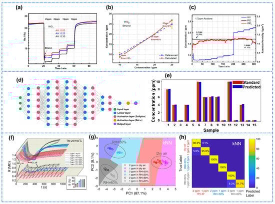(a) Transient resistance of WO3 sensor to ethanol with different concentrations and humidity conditions. (b) Calculation of concentration of WO3 sensor in response to ethanol. (c) Comparison of PID sensor and compensation model for WO3 sensor. Reprinted with permission from Ref. []. Copyright 2021, Elsevier. (d) Schematic illustration of deep BP neural network model structure with 14 layers. (e) The predicted outputs based on Adam optimizer with Softplus activation function. Reprinted with permission from Ref. []. Copyright 2022, Elsevier. (f) Repeated measurements of sensor responses of six sets of ([NO2], [RH]) paired groups. The inset shows the responsivity of each group. (g) PCA scores and classification with kNN. (h) Confusion matrix of the classification system. Reprinted with permission from Ref. []. Copyright 2020, Elsevier.