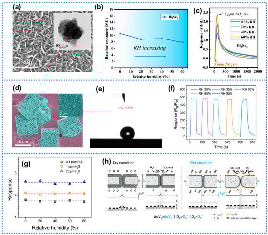 (a) SEM image of free−standing Bi2Se3 nanoplates, inset: TEM image of single Bi2Se3 nanoplate. (b) Baseline resistance of Bi2Se3 sensors at different humidity conditions. (c) Dynamic gas-sensing transients of the Bi2Se3 sensor to 5 ppm NO2 at different humidity conditions. Reprinted with permission from Ref. []. Copyright 2022, Elsevier. (d) SEM image of the porous In2O3 sample. (e) Water contact angle of the porous In2O3 sample. (f) Dynamic gas-sensing transients of the In2O3 sensor to 50 ppm NO2 as a function of RH at room temperature. Reprinted with permission from Ref. []. Copyright 2021, American Chemical Society. (g) Sensor responses toward different H2S concentrations as a function of relative humidity. (h) Schematic of the CuO nanosheet sensing layer from the aspects of morphology, energy band, and surface reactions under dry and humid conditions. Reprinted with permission from Ref. []. Copyright 2020, Elsevier.