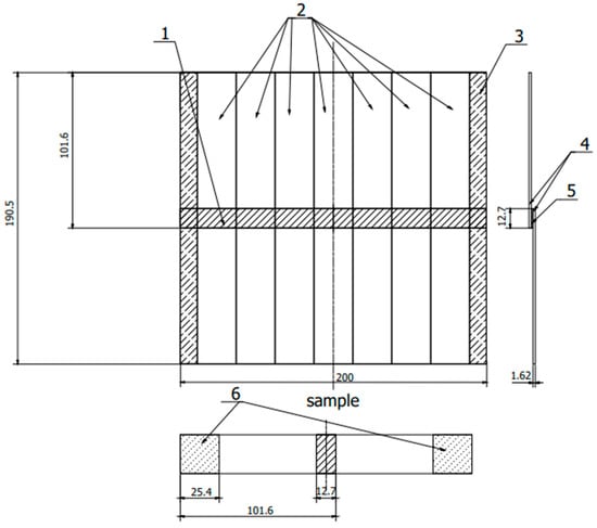 Scheme panel consisting of two plates joined together, from which samples were cut according to ASTM D 3762. 1—allowance rejected during cutting, 2—samples, 3—anti-adhesive tape, 4—sheet, 5—adhesive film. (All dimensions in the drawing are in [mm]).