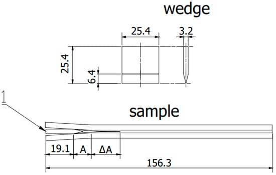 Scheme sample in accordance with ASTM D 3762. 1—wedge, A—initial flow area, ΔA—crack propagation after exposure. (All dimensions in the drawing are in [mm]).