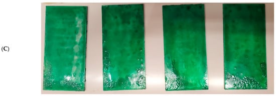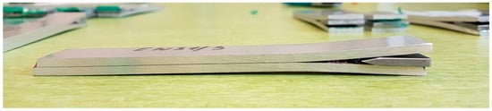Once the samples cooled down after annealing, one layer of the adhesive film was placed on one of the two pieces joined together. Additionally, a non-stick film was applied to the upper surface of the forms from which the panel was prepared in accordance with ASTM D3762 to enable the wedge test at the joint. Next, the protective foil of the adhesive film was removed, and the forms were joined (the forms were joined this way for all technologies). The correct pressure of the form joint forms was ensured during the curing process using a vacuum bag and was carried out in the oven at 120 °C for 90 min. After cooling, the pieces were removed from the vacuum bag and prepared for cutting (Figure 4).
