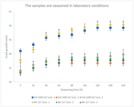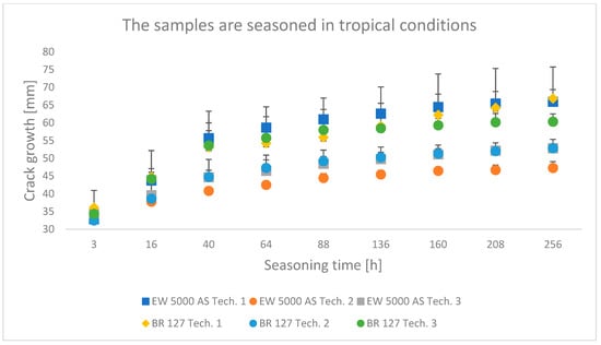 Average crack growth for samples depending on the seasoning time in tropical conditions for each type of sample preparation.