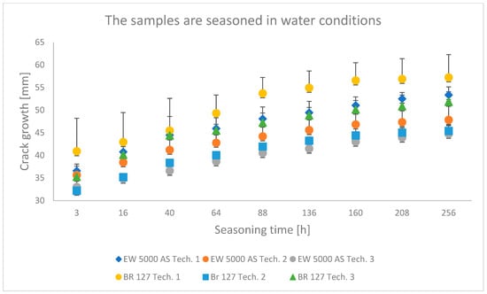 Average crack growth for samples depending on the seasoning time in tap water for each type of sample preparation.