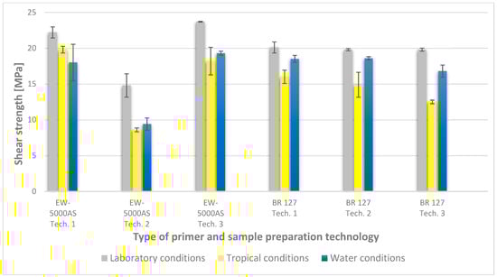 The results indicate that the shear strength values of the joints differ significantly when both primers are used, with the EW 5000 AS primer showing better properties for the first and third surface preparation technologies. On the other hand, the BR 127 primer is more stable, which is visible in the table (Figure 9), and only aggressive tropical conditions significantly reduce the shear strength value by about 20% in relation to laboratory conditions, regardless of the surface preparation technology.