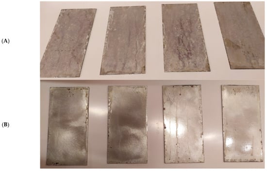 Corrosion tests were carried out to assess the corrosion resistance of samples with and without permanent anti-corrosion protection. Tests were conducted in an ASCOTT S450ipACC46 (Ascott Analytical Equipment Limited, Staffordshire, UK) salt chamber and sprayed with brine according to the PN-ISO 9227:2017 standard []. The great advantage of this type of research is its international standardization and its repeatability, especially in the case of samples prepared and constantly tested in the same laboratory conditions.