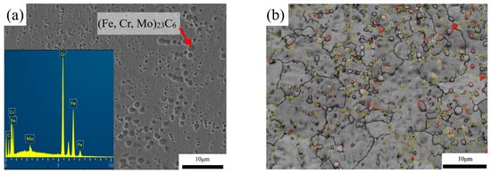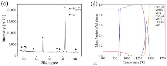 The commercial 5Cr15MoV martensitic stainless steel used in this study was annealed at 800 °C for 36 h. The microstructure characterization result is shown in Figure 1. As shown in Figure 1a,b, it can be clearly seen that the microstructure is composed of a large amount of spherical and ellipsoidal precipitates, ferrite and a small amount of retained austenite. The EDS result shows that these precipitates are Cr-enriched carbides. XRD results shown in Figure 1c indicate that the microstructure consists of ferrite and M23C6 carbides. The mass fraction of phases in the 5Cr15MoV martensitic stainless steel was calculated by Thermo-Calc using the TCFE7 database. As shown in Figure 1d, below 820.2 °C, the mass fraction of the M23C6 carbides remains unchanged at around 9.3%. Thus, the carbide is identified as (Fe, Cr, Mo)23C6.