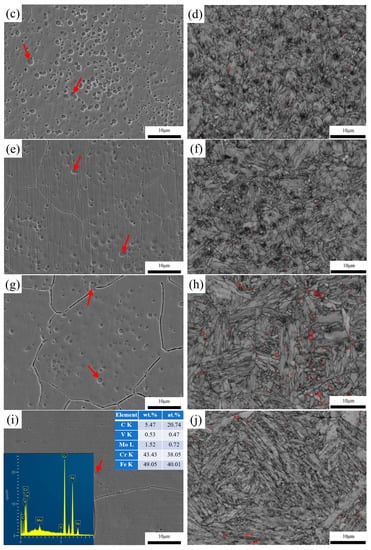 As can be seen in Figure 2, the microstructure of the as-quenched samples at different austenitizing temperatures is mainly composed of lath martensite, carbides and a small amount of retained austenite. In order to observe the carbides clearly, we used 10% sulfuric acid in saturated potassium permanganate solution to etch samples, in which the carbides are eroded and the martensite matrix is not eroded. However, the morphology of the martensite matrix can be observed clearly in the band contrast (BC) map by using EBSD. In Figure 2, the red arrows point to carbides. As shown in Figure 2, the morphologies of carbides are mainly spherical and ellipsoid, which were inherited from the annealed state [15]. It is well-known that the area fraction equals the volume fraction if the particles distribute uniformly in the matrix [19]. The volume fractions of carbides summarized in Table 3 were counted by using the image processing method based on the SEM images. With an increase of the austenitizing temperature from 950 to 1150 °C, the volume fractions of carbides decrease from 8.82% to 0.25%. Notably, the volume fraction of the carbides decrease rapidly at 1050 °C. At 950 °C, the carbides dissolve slightly, and the prior austenite grain boundaries are indistinct. With an increase of the austenitizing temperature, carbide dissolution accelerates and the size of prior austenite grains also increase. When the austenitizing temperature reaches 1150 °C, the carbides almost disappear. According to the results of EDS shown in Figure 2i and the XRD shown in Figure 3, the carbides are M23C6 (M = V, Mo, Cr, Fe).
