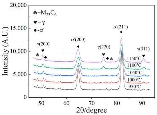 As shown in Figure 2b,d,f,h,j, the martensite lath retained austenite, which is indicated in the red regions that are observed clearly. With an increase in the temperature, the size of the martensite lath becomes finer. Due to the inaccurate volume friction of the retained austenite, by using EBSD results, which were collected in a small area, the XRD measurement was carried out, and the results are shown in Figure 3. At an austenitizing temperature of 950 °C, the diffraction peaks of M23C6 and martensite are the strongest, while the diffraction peaks of austenite are the weakest. With an increase in the austenitizing temperature, the diffraction peaks of M23C6 and martensite become weaker, and the diffraction peaks of austenite become stronger. The calculated result of the retained austenite volume fraction by Equation (1) is shown in Table 3. At austenitizing temperature of 950 °C, the volume fraction of retained austenite is 1.95%. At austenitizing temperature of 1150 °C, the volume fraction of retained austenite is 11.10%. In Figure 3, a very pronounced decrease of 2-theta for martensite with the increase of austenitizing temperature can be observed, which corresponds to an increase of lattice parameters, implying more carbon in the martensite. These results indicate that with an increase in the austenitizing temperature, the volume fraction of retained austenite increases because the Ms temperature decreases as the number of C and alloying elements increases [3].