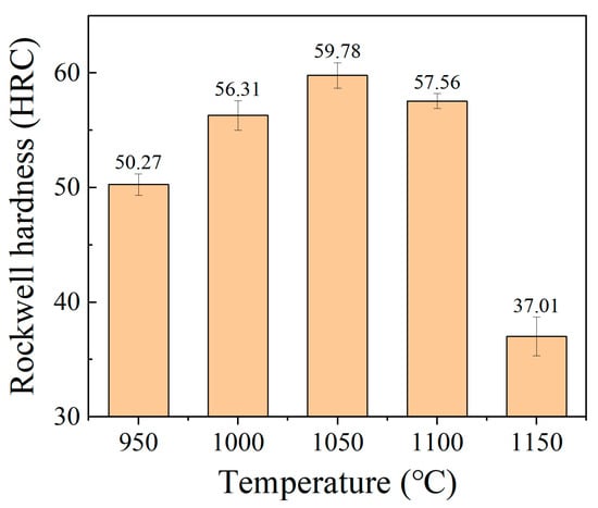 Figure 4 shows the Rockwell hardness of the samples after oil quenching at different austenitizing temperatures. The results show that the hardness of the experimental steel increases with the increase of the austenitizing temperature in the range of 950–1050 °C, and the hardness increases from 50.3 HRC to 59.8 HRC. However, the hardness decreases from 59.8 HRC to 37.0 HRC as the austenitizing temperature is in the range of 1050–1150 °C, which is due to the softening effect of retained austenite.