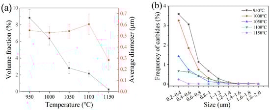 Based on the SEM images, the size and morphology of M23C6 carbides were investigated at different austenitizing temperatures. The morphology of carbides was mainly spherical and ellipsoid. As shown in Figure 5a, with an increase in the austenitizing temperature, the volume of M23C6 carbides decreased gradually, and the average diameter of M23C6 carbides did not decrease monotonically. With an austenitizing temperature in the range of 950–1050 °C, the average diameter remained the same at approximately 0.53 μm. At the austenitizing temperature 1100 °C, the average diameter increased by a small margin to 0.6 μm. When the austenitizing temperature was 1150 °C, the average diameter decreased to 0.28 μm rapidly. As shown in Figure 5b, with an increase in the austenitizing temperature, the frequency of tiny M23C6 carbides decreased rapidly. This result was basically consistent with the previous study [15]. However, the study [15] indicated that the dissolution of M23C6 carbides was distinguished in three stages based on the changes in the content and the size of carbides. Firstly, small-sized carbides (<0.5 μm) dissolved dominantly. Secondly, large-sized carbides (<1 μm) dissolved dominantly. Lastly, larger-sized carbides (>1 μm) began to dissolve. These distinctions might not be correct.