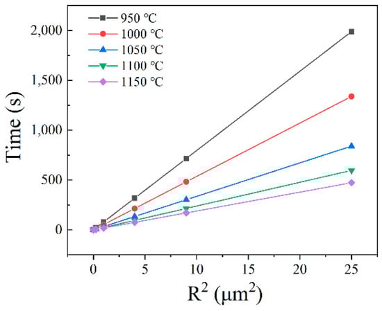 According to Equations (2)–(4), the dissolution behavior of carbides can be discussed in detail. When the initial size of carbides remains unchanged and temperature increases, and increase, which results in decreasing. In addition, the temperature is assumed to be constant, and the is only determined by the particle size and is proportional to the square of the particle radius. Using the Thermo-Calc with TCFE7 database, the content of Cr in the matrix side at the precipitate-matrix interface was calculated. Thus, the time of carbides dissolution can be calculated. Figure 6 shows the dissolution kinetics of carbides at different temperatures. It is clear that the dissolution time of carbides is proportional to the square of the particle radius, and the higher the temperature, the faster the dissolution.