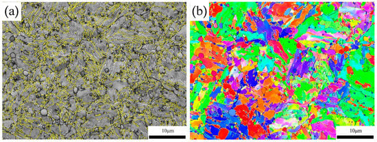 After quenching, metallographic specimens were ground, polished and etched with 10% sulfuric acid in saturated potassium permanganate solution in order to observe carbides. The microstructure was investigated by TESCAN CLARA GMH field emission scanning electron microscope (FE-SEM) (TESCAN Brno, s.r.o., Brno, Czech Republic) equipped with an Oxford UlitmMax65 energy dispersive spectrometer (EDS) (Oxford instruments, Abingdon, UK) and Oxford Symmetry S2 electron backscattering diffraction (EBSD) (Oxford instruments, Abingdon, UK). Samples for EBSD study were electropolished using a solution containing 87% alcohol, 8% perchloric acid and 5% glycerol. Next, the crystallographic information was analyzed by Channel 5 software (version: 5.12.74.0) from Oxford-HKL (Oxford instruments, Abingdon, UK). MATLAB software (version: 2021b) was used for crystallographic analysis [16,17].
