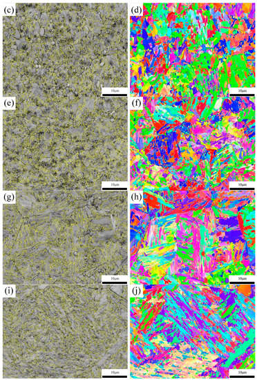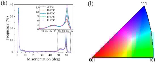 Figure 7 displays the BC maps and IPF maps of quenched samples. The boundaries in Figure 6 are drawn for misorientation between adjacent points larger than 5°, because the misorientation calculations imply that all of the boundaries between variants should have misorientations larger than 10°. To clearly depict the variant morphology in BC maps, the boundaries are divided into three types according to the misorientation: white lines (5° < θ < 15°), black lines (15 < θ < 45°) and yellow lines (θ > 45°). With an increase in the austenitizing temperature, as well as an increase in the dissolved carbon content, the size of the packet becomes larger, but the lath is refined and the frequency of the high-angle grain boundaries (HAGBs, θ > 45°) increases significantly, as shown in Figure 7k.