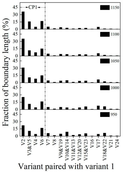 It is well known that 24 specific ferrite orientations (variants, V1–V24) could be formed within a single austenite grain in the K-S orientation relationship (OR): {111}γ//{110}α, <110>γ//<111>α [23,24]. However, the actual OR of martensite with respect to an austenite matrix would always deviate some degrees to the exact K-S OR due to the transformation strain. Using iterative numerical calculation methods developed by the authors’ research group based on the Euler angle database from the EBSD results [16,17], the actual average OR of each sample was calculated, which is shown in Table 5. The fraction of 23 variant pairs (V1/V2-V24) was calculated in the samples based on the calculated OR, which is shown in Table 6. To identify the variant selection, the length fraction of inter-variant boundaries between V1 and other variants, we employed the specific calculation method explained in reference [25], which is shown in Figure 8. It can be seen that the V1/V2 variant pairs consistently governed the martensite transformation. With an increase in the temperature, the length fraction of the inter-variant boundary of the V1/V2 variant pair also increased. Study [26] indicated that the increase of carbon led to a decrease of the transformation temperature and an increase of the transformation driving force, such that more V1/V2 variant pairs were obtained to accommodate the transformation strain to improve the hardenability in 0.12C steel and 0.09C steel. Thus, in this study, the fraction of the boundary length of the V1/V2 variant pair that increased with the increase of the temperature was due to the effect of the carbon content from 0.075 wt.% to 0.45 wt.%. This discussion can explain the frequency of high-angle grain boundaries increasing with the increasing temperature. According to references [27,28], there was a near-linear relationship of hardness and density of high-angle grain boundaries. Thus, the hardness would increase with the increasing temperature. However, in this study, the hardness increases first and then decreases with the increase in density of the high-angle grain boundaries.