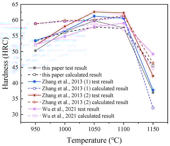 As shown in Figure 9, for this study, the experimental results and the calculated results are in good agreement at the range of 1000–1100 °C, although the maximum hardness value differs by 2 HRC. For the results from Ref [32], at 950 °C, the calculated result is larger than experimental result (>5 HRC). This might be sensitivity to the volume of carbides at 950 °C, because the dissolution of carbides is slow at 950 °C. At the range of 1000–1100 °C, the experimental results and the calculated results are in good agreement. As for the results from Ref [33], the experimental results and the calculated results are in good agreement at the range of 950–1100 °C. These suggest that this simple model was still relatively accurate, which showed that the contribution to hardness came mainly from martensite, and a small amount of retained austenite (<10%) had little effect on hardness; however, a large amount of retained austenite (>10%) had a very negative effect on hardness. Due to the small content of carbides, they contributed less to hardness.