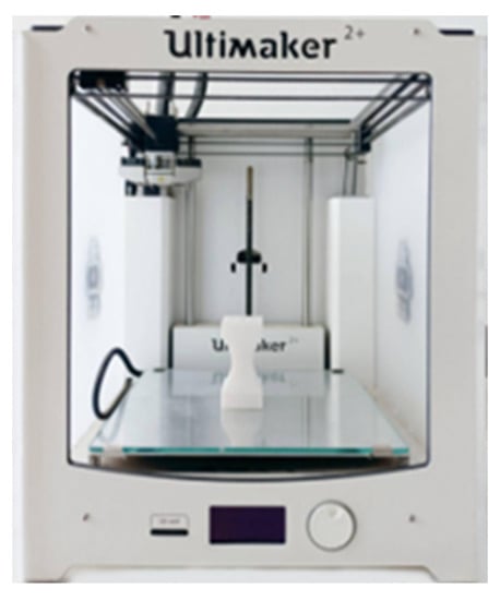 The test specimens were fabricated in a Ultimaker2+ printer [28], as shown in Figure 2, which provides a maximum build volume of 223 × 223 × 205 mm3. The nozzle of the printer moves in the x and y direction while the build platform moves in the z-direction. The available nozzles are 0.25, 0.4, 0.6, and 0.8 mm in diameter, and the maximum heating temperature can reach 260 °C. The platform temperature is 20–110 °C, the layer resolution is 20–200 μm, and the printing speed is 30–300 mm/s. The printer mainly supports the printing of PLA and ABS, which have been the primary filament materials since the beginning of FDM technology. PLA is an aliphatic thermoplastic polymer that is obtained from raw materials of natural origin, such as cornmeal. Due to its non-toxicity, biodegradability, and biocompatibility, PLA can be used in many industries as well as in medicine in biomedical applications. ABS is a thermoplastic polymer that is extremely resistant to impact, abrasion, and chemical elements [29]. The material used for manufacturing the test specimens was PLA and ABS filament of 3 mm diameter produced by Jingtian Century Technology Co., Ltd. (Zhuhai, China). The density of the PLA filament is 1.24 ± 0.05 g/cm3, and its ultimate tensile strength is 60 MPa. The ABS filament has a density of 1.04 ± 0.2 g/cm3, its ultimate tensile strength is 72–90 MPa, the flexural strength is 96–120 MPa, and the compressive strength is 96 MPa. All printing parameters used in this study are summarized in Table 1.