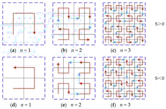 - The Hilbert curve outside the contour is trimmed to fit the contour, and the trimmed Hilbert curve coordinates are stored. The generation strategy of the Hilbert curve is shown in Figure 3 [34]. The magnified square of each slice contour is divided into 2 × 2 square grids, and the centers of the four-square grids are connected in sequence from the south-west corner in a clockwise (denoted by S > 0) or counterclockwise (denoted by S < 0) direction, and cup-shaped first-order Hilbert curves facing south and west are generated, respectively, as shown in Figure 3a,d. If the magnified square is divided into 22 × 22 square grids, and draw a single curve with every center of the square grids in certain rules until the curve fulfills the whole plane, a second-order Hilbert curve is generated, as shown in Figure 3b,e. In the same way, a third-order Hilbert curve is generated by connecting every center of the square grids with 23 × 23 sections, as shown in Figure 3c,f.