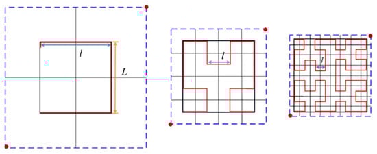 To enable the infill density of the filling curve to change according to the cross-sectional area, the order of Hilbert curve n is taken as a fixed value. The cross-section is filled layer by layer, and the side length l equals L/(2n – 1), when the n equals 1, 2, 3, the side length l equals L, L/3, and L/7, respectively, as shown in Figure 4.
