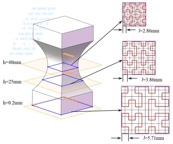 When the order of Hilbert curve n takes 2, each slice was subdivided thrice, and the infill patterns within each slice at various heights are similar, as shown in Figure 5, but the side length of the Hilbert curves decreases with decreasing cross-sectional area. When the heights of the model are 0, 25, and 40 mm, the corresponding cross-section gradually decreases, and the theoretical value of the side lengths of the Hilbert curves are 5.71, 3.86, and 2.86 mm, respectively.