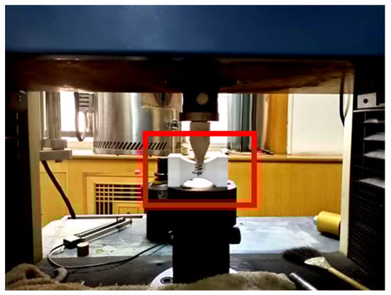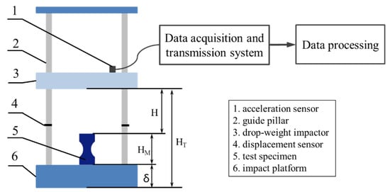The dynamic compression tests were carried out on a DY-3 dynamic compression tester (see Figure 7) produced by Xi’an Jiesheng Electronic Technology Co., Ltd. (Xi’an, China). The dynamic compression tester is mainly composed of a drop-weight impactor, acceleration sensor attached to the impactor, guide pillar, displacement sensor, and impact platform. The minimum drop height recorded by the sensor is 20 cm, the weight of the impactor is 7 kg, and its drop process before contacting the test specimen is in free fall. The drop height, impact energy, and load in the impact process are calculated as follows: