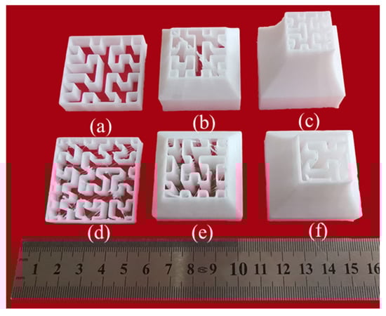 The specimens with adaptive-density filling structures and uniform filling structures were incompletely printed with a height of 10 mm, 25 mm, and 40 mm, respectively, and the side length of the Hilbert curves was measured using a digital caliper with an accuracy of 0.01 mm. The corresponding cross-section of the incompletely printed samples with different heights is shown in Figure 8. It was found that the measured average side length of the Hilbert curves for the uniformly filling structure is 3.78 ± 0.01 mm in the cross-sections at any height, whereas the average side length of the Hilbert curves for the adaptive-density filling structure is 5.51 ± 0.02 mm, 3.79 ± 0.03 mm, and 2.72 ± 0.04 mm, respectively, indicating that the side length of the Hilbert curve decreases with the decreasing cross-section for the adaptive-density filling structure.