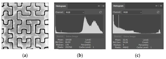 Black and white image of cross-section except for contour (a); gray level histogram of the entire filled area (b); gray histogram of the black filling curve (c).