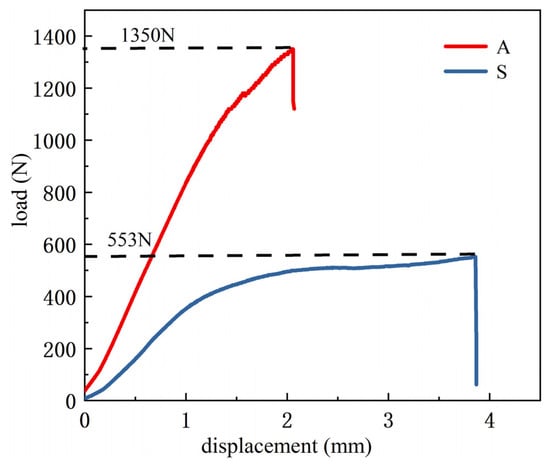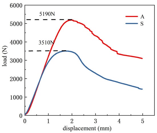 Figure 11 depicts the load-displacement curves of the specimens with two infill structures. It can be seen from Figure 11 that the load increases rapidly with the increase in compression displacement, after reaching the peak, the load decreases gradually. The peak loads of curve S and curve A are 3510 N and 5190 N, and the compression displacements corresponding to the peak load are 1.68 mm and 2.0 mm, respectively. The load-bearing capacity of the adaptive-density-filled specimen is 1680 N higher than that of the uniformly filled specimen and improved by about 47%. The failure time of the adaptive-density-filled specimen is also later than that of the uniformly filled specimen, which confirms that the adaptive-density filling structure is beneficial to improving the overall mechanical properties of the printed specimen.