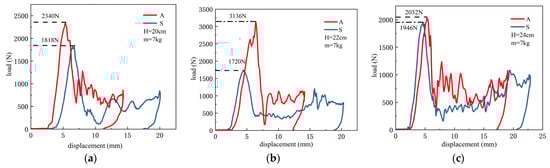 Load–displacement curve during the dynamic compression tests at different drop heights (H), H = 20 cm (a); H = 22 cm (b); H = 24 cm (c), (S denotes uniformly filled specimen, and A denotes adaptive-density-filled specimen).