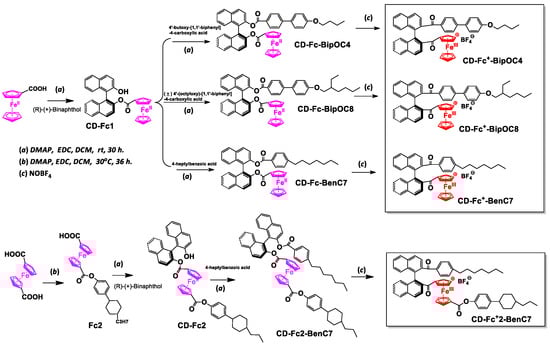 Synthetic routes of ferrocene chiral derivatives and ferrocene chiral ions (a) DMAP, EDC, rt, 30 h; (b) DMAP, EDC, 30 °C, 36 h; (c) NOBF4.
