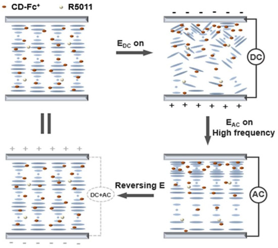 The observation of electronic tuning reflection bandwidth of all LC samples was carried out according to the following steps, as shown in Figure 2. Firstly, in the initial state, the CD-Fc+ in the cholesteric liquid crystal without electric field was uniformly distributed. The pitch of the cholesteric phase was uniform and single and the LC molecules were periodically arranged, showing a standard planar texture and reflecting narrow circularly polarized light. Then, when the DC electric field in the direction of the parallel spiral axis was applied to the LC cell for a certain time, the cationic CD-Fc+ diffused and migrated to the negative electrode of the ITO glass substrate under the electric field. The content of the chiral compound CD-Fc+ would then have a certain concentration gradient. That is, it gradually decreased from top to bottom. At the same time, the migration of anion BF4− was opposite to that of CD-Fc+. Since the anion did not possess a chiral structure, its migration in the electric field cannot affect the pitch distribution. The negative LC molecule BHR28000-300 showed a dynamic scattering state due to the disturbance of anion and cation migration. The LC texture plane texture was broken into disorder, showing a focal cone texture. This state can be maintained for a long time after the external electric field was turned off. Then, after fast application of high-frequency AC electric field (τAC = 2 s, f = 100 kHz), the LC molecules would be parallel oriented again, caused by the negative dielectric anisotropy of the LC. However, CD-Fc+ with a certain concentration gradient cannot be recovered immediately. This resulted in a pitch gradient in the plane state, and a wide reflection band of the sample. This can reflect a certain range of circularly polarized light. On the other hand, when an opposite DC electric field was applied to the upper LC cell for a certain time, CD-FC+ would be uniformly dispersed into the LC phase again. Due to the migration of anions and cations, the planar texture of LC molecules was destroyed again, showing a light scattering focal cone state. After fast application of high-frequency AC electric field again (τAC = 2 s, f = 100 kHz), the LC molecules tended to be arranged parallel to the substrates again. They would return to the initial single pitch arrangement and the reflection band would also return to the initial state. After high frequency AC electric field was applied to the LCD cell again quickly (τAC = 2 s, f = 100 kHz), the LC molecules tended to be arranged parallel to the substrate again, showing a single pitch arrangement, and their reflective band returned to the initial state. In summary, by applying electric fields of different frequencies or directions, the LC mixture can switch between three different optical states: transparency, scattering and broadband reflection. After each electric field was turned off, each corresponding state can remember the state for a certain time.