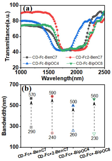 (a) UV transmission spectra (b) electronically controlled reflective bandwidth of LC samples doped with CD-Fc+ of different structures.