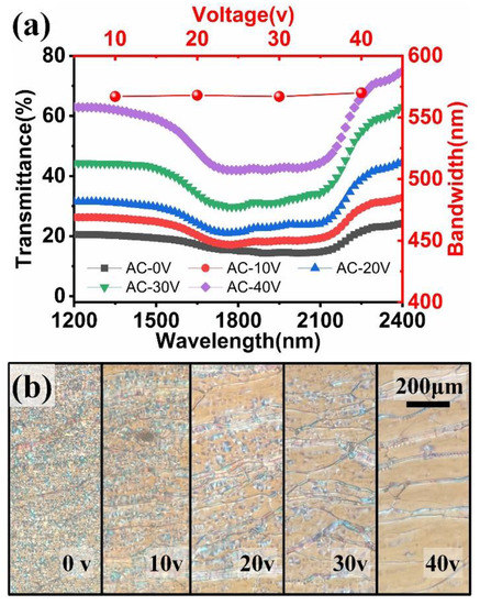 Influence of AC voltage intensity on (a) UV transmission spectra and (b) LC texture of focal cone state in LC sample 1.