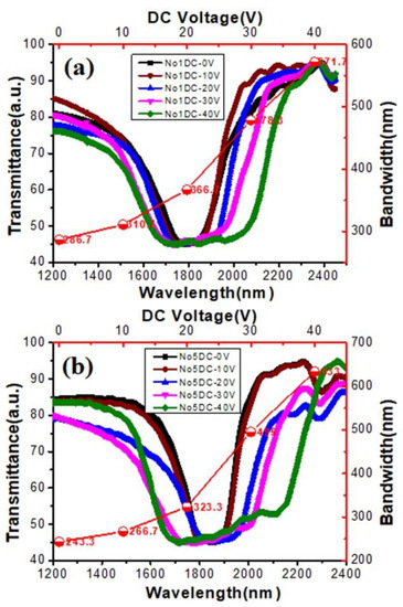 Influence of DC voltage intensity on the UV transmission spectrogram and reflection bandwidth of (a) sample 1 and (b) sample 5.
