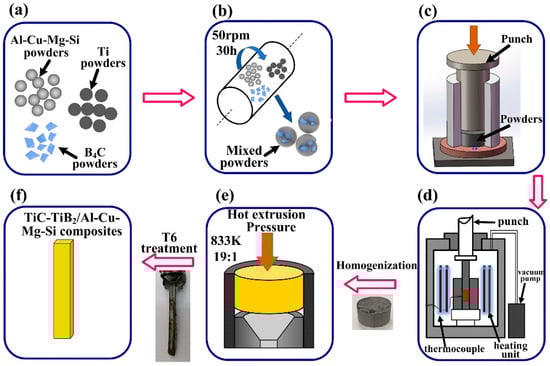 Process flowchart for the preparation of (TiC-TiB2)/Al-Cu-Mg-Si composites in Al-Ti-B4C system by combustion synthesis and vacuum hot-pressing and assisted by a hot-extrusion process. (a) Raw powders, (b) ball milling, (c) cold pressing, (d) combustion synthesis, (e) hot extrusion, and (f) the prepared (TiC-TiB2)/Al-Cu-Mg-Si composites.