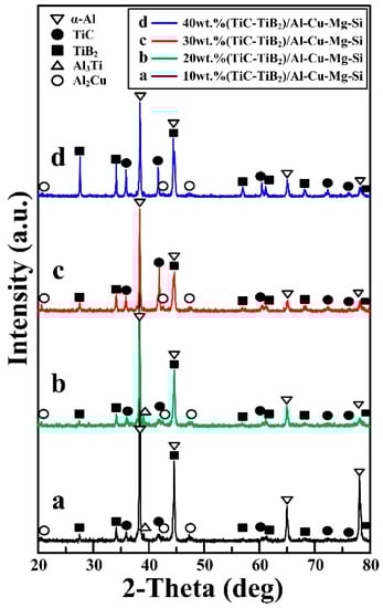 Figure 3 shows the XRD analysis results of the prepared in situ (TiC-TiB2)/Al-4.7Cu-0.32Mg-0.44Si composites with different TiC and TiB2 particle content. The reaction products of the Al-Ti-B4C systems mainly consisted of Al, CuAl2, TiC and TiB2 phases. An intermediate Al3Ti phase was observed in the 10 wt.% and 20 wt.% (TiC-TiB2)/Al-4.7Cu-0.32Mg-0.44Si composites due to insufficient reaction of the Al-Ti-B4C systems. The intensity of the detected TiC and TiB2 phases increased with increasing TiC and TiB2 particle content from 10 wt.% to 40 wt.%.