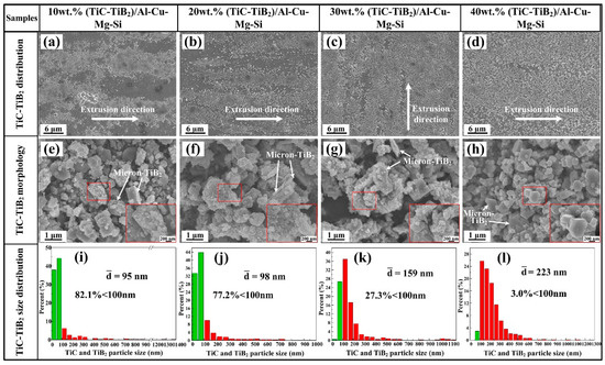 FESEM images of TiC-TiB2 particle distribution and morphology, and size distribution diagrams. (a,e,i) 10 wt.% (TiC-TiB2)/Al-4.7Cu-0.32Mg-0.44Si; (b,f,j) 20 wt.% (TiC-TiB2)/Al-4.7Cu-0.32Mg-0.44Si; (c,g,k) 30 wt.% (TiC-TiB2)/Al-4.7Cu-0.32Mg-0.44Si; (d,h,l) 40 wt.% (TiC-TiB2)/Al-4.7Cu-0.32Mg-0.44Si. The green bars in Figure 4i–l represent the percentage of nano-sized particles, while the red represents the percentage of sub-micron and micron sized particles.