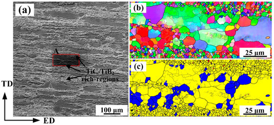 Figure 5a shows an SEM image for the 10 wt.% (TiC-TiB2)/Al-4.7Cu-0.32Mg-0.44Si composite after T6 heat treatment. Figure 5b,c show the IPF and recrystallized microstructure maps of area A in Figure 5a. The high-angle grain boundaries (HAGBs, ≥15°) and low-angle grain boundaries (LAGBs, 2–15°) are marked by black lines and gray lines, respectively. Figure 5c shows the deformed grains, sub-grains and recrystallized grains of the composite, which are marked by red, yellow and blue colors, respectively. The composite had a bimodal microstructure containing large-sized sub-grains and fine recrystallized grains. The α-Al grain sizes near the TiC- and TiB2-particle-rich regions (0.3 μm) were much smaller than those near the lean regions (34.5 μm). Dynamic recrystallization could not be avoided during hot extrusion. The nano-sized and sub-micro-sized TiC and TiB2 particles distributed on the grain boundaries (GBs) may inhibit the rotation and merging of GBs and the growth of α-Al grains [9,30]. Accumulated dislocations in the inner α-Al grains were caused by the TiC and TiB2 particles and then LAGBs formed, as seen in Figure 5b. It is possible that multi-sized α-Al grains result in superior mechanical properties of the composites [15].