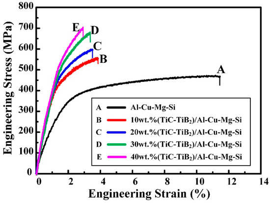 The room-temperature tensile engineering stress-strain curves of the Al-4.7Cu-0.32Mg-0.44Si alloy and in situ (TiC-TiB2)/Al-4.7Cu-0.32Mg-0.44Si composites.