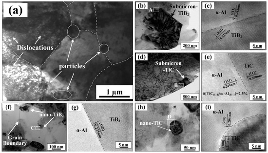 Figure 7a shows a TEM microstructure image of the 10 wt.% (TiC-TiB2)/Al-Cu-Mg-Si composite following the hot-extrusion process and heat treatment. Multi-sized TiC and TiB2 particles, marked by circles, were located at the inner and grain boundaries (GBs) of α-Al grains. Hexagonally shaped submicron-sized TiB2 particles of approximately 800 nm diameter are shown in Figure 7b. Figure 7c shows the corresponding HRTEM image of zone A in Figure 7b. The clean and continuous TiB2-Al interface helped to increase the strength of the composites [23,30]. Figure 7d shows an image of a cubic-shaped sub-micron TiC particle of about 300 nm width. An HRTEM image of zone B in Figure 7d is shown in Figure 7e, illustrating a clean TiC-Al interface with mismatched low lattice (2.5%). Figure 7f,g show the TEM image and corresponding nano-sized TiB2 particle. Figure 7h,i show nano-sized TiC particles with spherical shapes. Figure 7g,i show the HRTEM images of zone C and zone D in Figure 7f,h, respectively. The TiC and TiB2 particles, located in the interior of α-Al grains effectively restricted the dislocation movements, generated dislocation accumulations, and increased the strength (σ0.2, σUTS) of the composites. TiC and TiB2 particles occurring at the GBs could restrain the grain boundary rotations of the α-Al grains and the plastic deformations of the composites, contributing to increased strength and hardness of the composites.